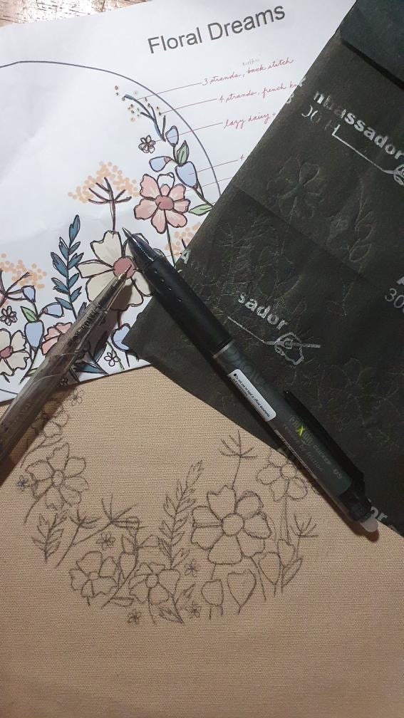 You might also want to add a FABRIC ERASE PEN. (See it in action) Use it to transfer the pattern on the fabric. Once you're done, remove the marking with a blow dryer or an iron. Always test first on your fabric!