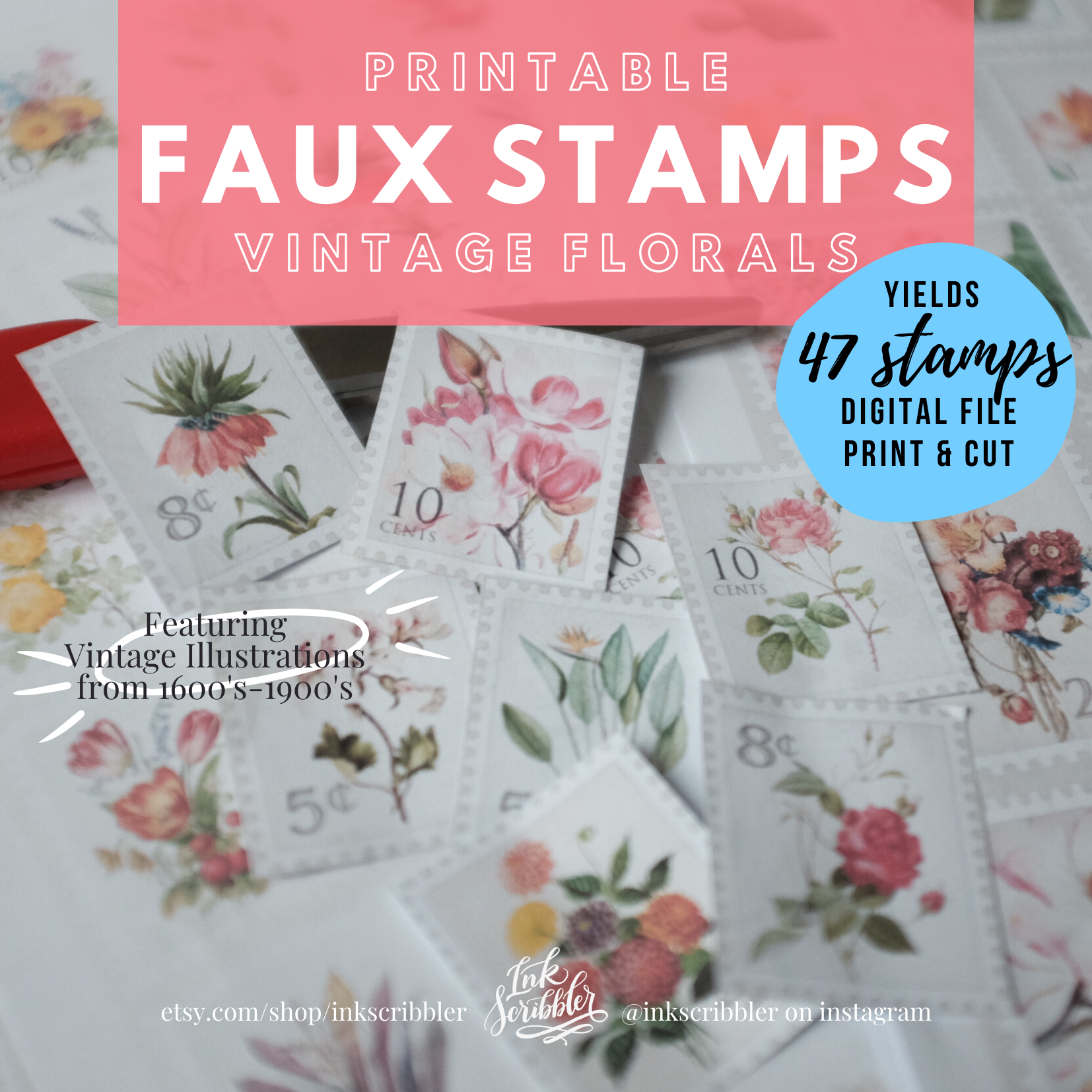 - Yields 47 faux postage stamps